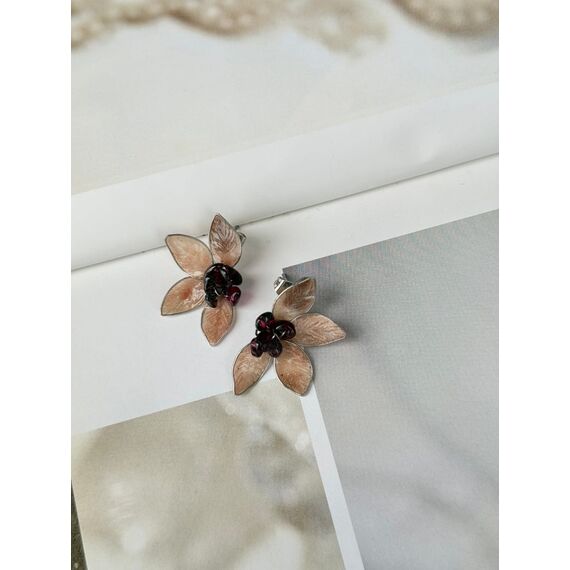Garnet sırğaları beş ləçəkli çiçək formasında hazırlanıb; ləçəklər çəhrayı çalarlıdır və yüngül mirvari parıltısına malikdir.