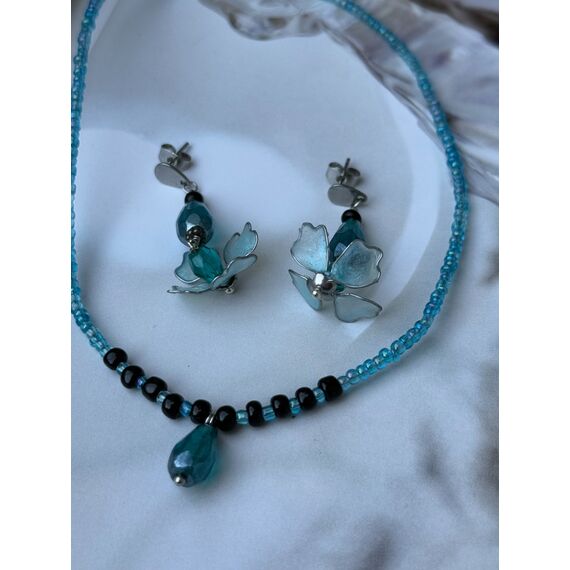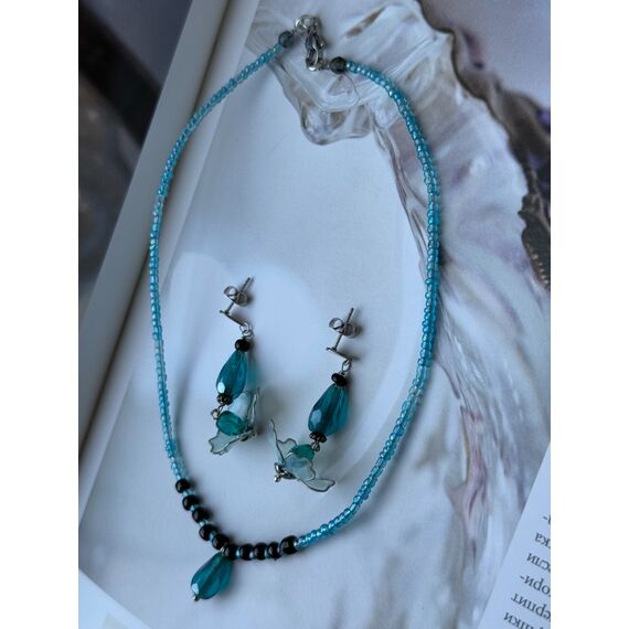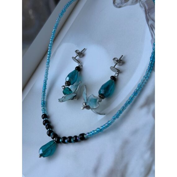 Boyunbağı iki rəngli — açıq mavi və qara muncuqlardan ibarətdir. Açıq muncuqlar dəniz səthinin parıltısını xatırladan əsas əhval yaradır. Kompozisiyanın mərkəzindəki tünd muncuqlar kontrast və vizual dərinlik əlavə edir. Boyunbağının sonunda, sırğalarla eyni tərzdə, iri firuzəyi damla formalı muncuq yerləşir — bu da dəstin bütün elementlərini bir-birinə bağlayır.