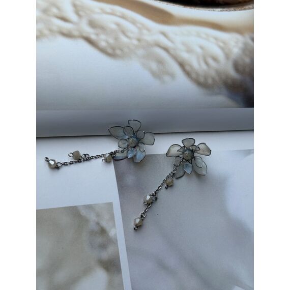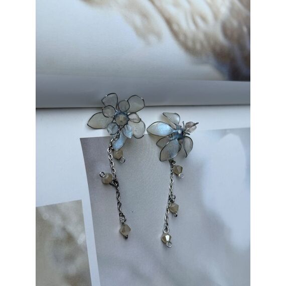 Miraj — zərif, sanki havadan toxunmuş çiçək formasında hazırlanmış sırğalardır. Hər bir çiçək nazik şüşəni və ya mirvari emalı xatırladan yarı şəffaf ləçəklərdən ibarətdir. Ləçəklər yumşaq, soyuq çalarda — bir qədər dumanlı və ya südlü-göy tonlardadır. Çiçəyin mərkəzində yerləşən kiçik açıq rəngli muncuq dizayna incə parlaqlıq və diqqət mərkəzi verir.