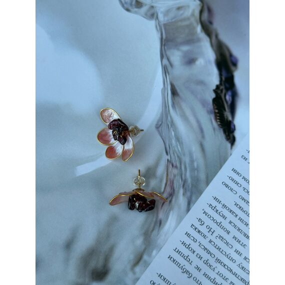 Çiçəyin mərkəzində tünd bordo rəngli xırda daşlar sıx şəkildə düzülüb, dizaynda diqqət mərkəzi və həcmi yaradır. Ruby üslubu eleqant və qadınsıdır, yüngül retro notları ilə seçilir. Bu sırğalar maqnoiya və ya orkide çiçəklərini xatırladır və romantik, həm də axşam obrazları üçün mükəmməl seçimdir.