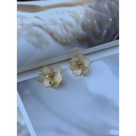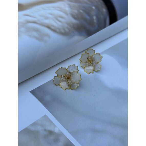 Shafag — zərif və qadınsı dizayna malik sırğalardır, incə çiçək formasında hazırlanıb. Ləçəklər şəffaf materialdandır, yumşaq mirvari parıltısına malikdir və kənarları incə qızılı xəttlə haşiyələnib, bu da bəzəyə zəriflik və yüngül parlaqlıq bəxş edir. Çiçəyin mərkəzində yerləşən kiçik şəffaf kristallar işıq əks etdirdikdə incə parıltı yaradır.