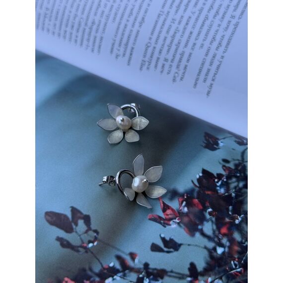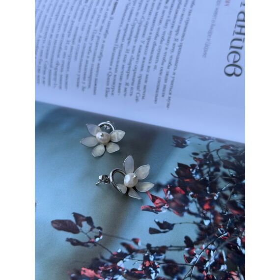 Shukran — incə çiçək formasında hazırlanmış zərif sırğalardır. Hər bir çiçək beş ləçəkdən ibarətdir; ləçəklər yumşaq mirvari parıltısına malikdir və mərkəzdə yerləşən səliqəli mirvari muncuq bəzəyə zərif vurğu qatır. Metal hissələr nəcib gümüşü çalardadır və sırğalara yüngüllük və incəlik bəxş edir.