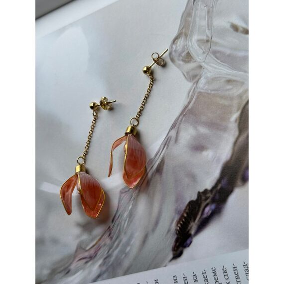 Серьги Tulip выглядят очень изящно и женственно. Они выполнены в виде бутонов тюльпанов — подвески состоят из лепестков из прозрачного розово-кораллового материала с плавным переходом оттенков и белыми прожилками, напоминающими структуру настоящего лепестка. Края лепестков аккуратно окантованы золотистым металлом, что придаёт украшению утончённость и завершённость. Подвески крепятся к ушной застёжке через тонкую золотую цепочку, создающую лёгкое движение при ношении. Основная фурнитура — гладкий, блестящий металл золотого цвета.